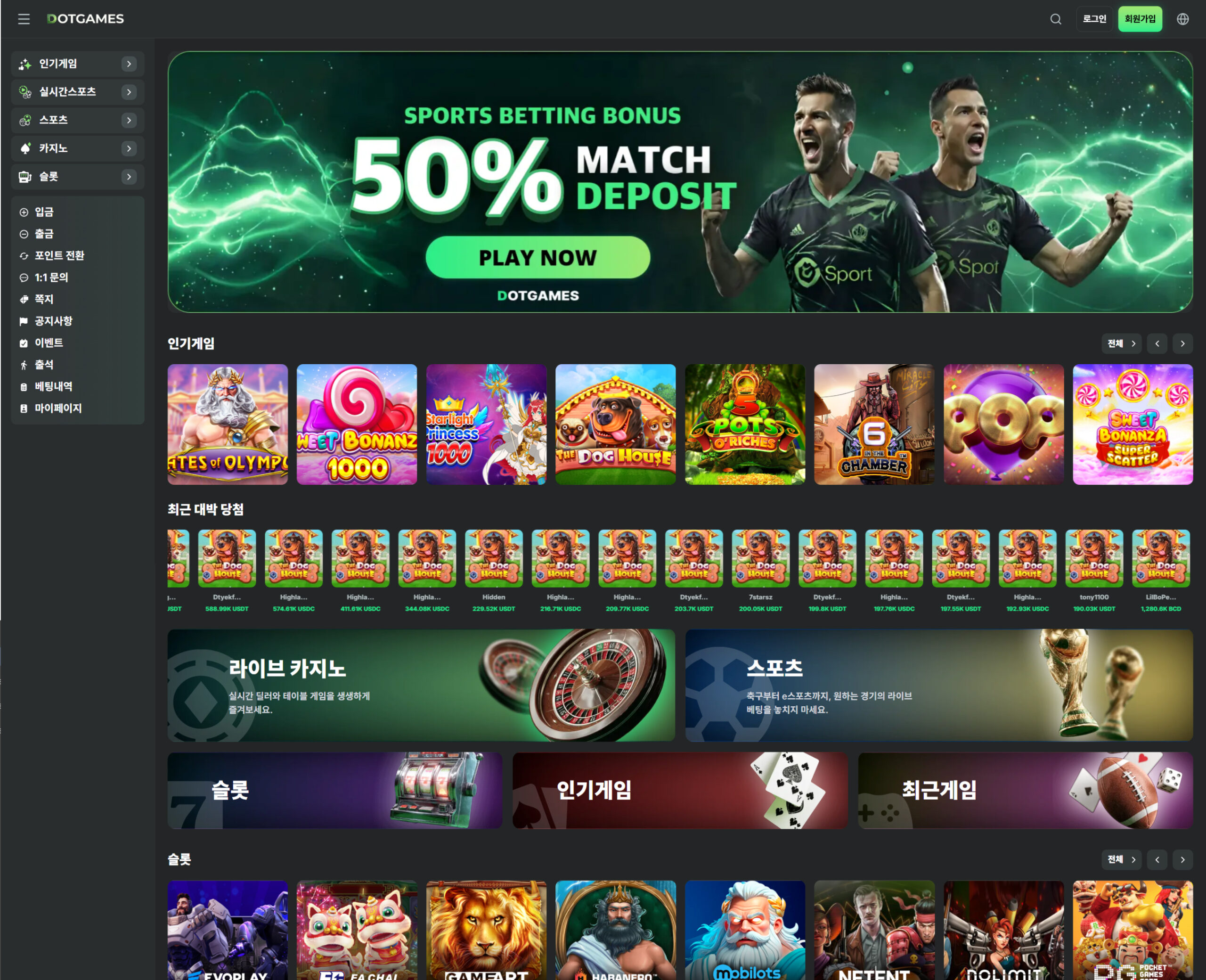 • 인피니트 그리드 시스템: 스크롤을 내리며 인기게임, 최근 당첨 내역, 라이브 카지노, 스포츠 등을 끊임없이 탐색할 수 있는 구조입니다.