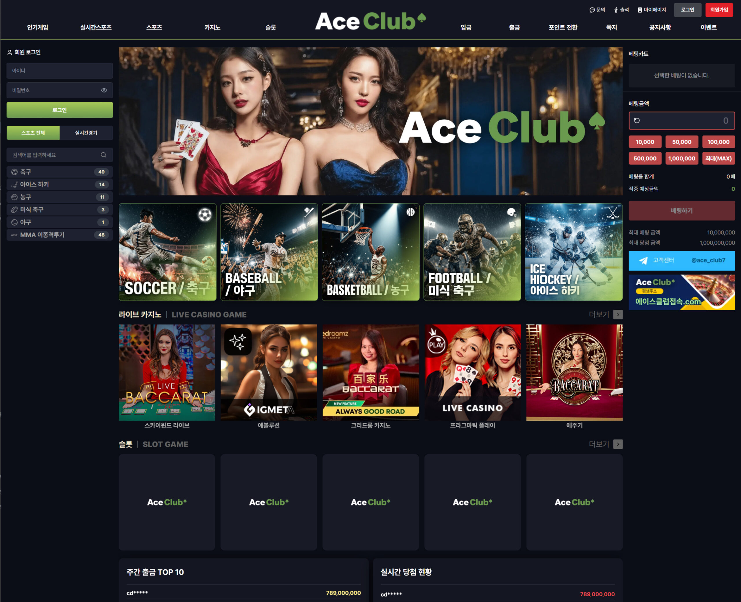 • 직관적인 카드 UI: 스포츠 종목과 카지노 게임을 큼직한 썸네일 카드로 배치하여 모바일 환경에서도 오터치 없는 쾌적한 선택이 가능합니다.